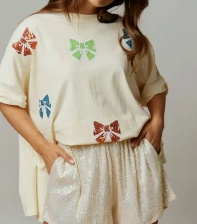 Ivory cotton short sleeve top with colorful chenille bow patches. Oversized fit (we recommend sizing down for a fitted look).